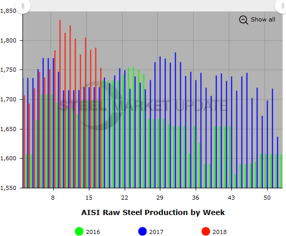 Below is a graph showing the history of weekly raw steel production. You will need to view the graph on our website to use its interactive features; you can do so by clicking here. If you need assistance logging into or navigating the website, please contact our office at 800-432-3475 or info@SteelMarketUpdate.com.