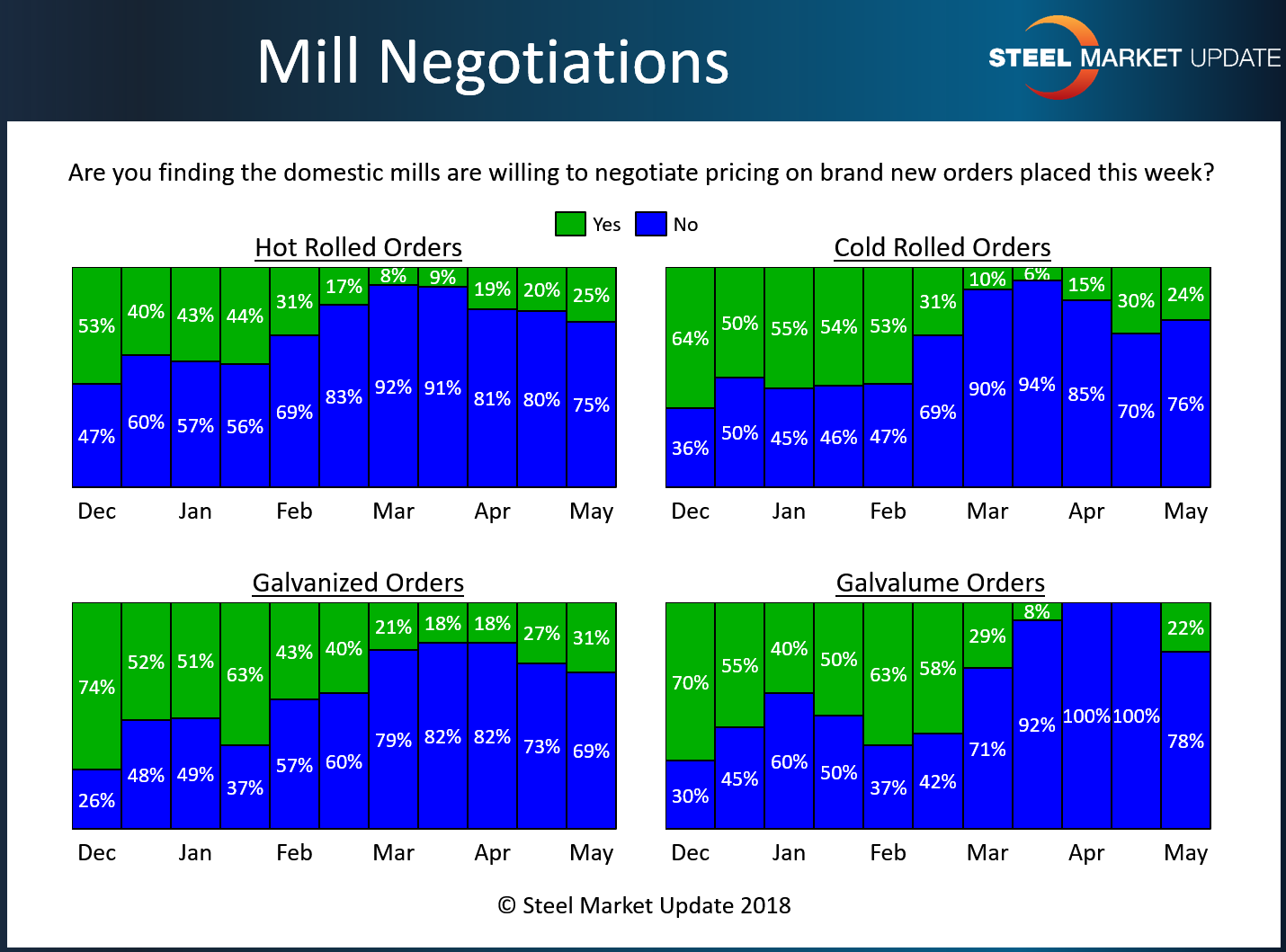 In all four products (hot rolled, cold rolled, galvanized and Galvalume) about one-quarter of the respondents report that their mill suppliers are being responsive to some price negotiations.