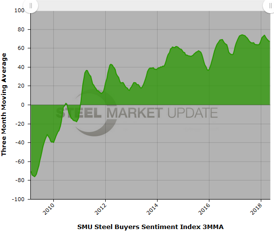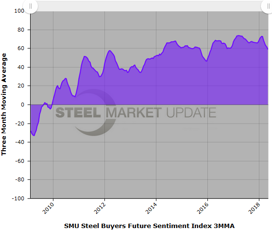 Steel Market Update prefers to utilize our 3-month moving average as a truer gauge of the trend and to recognize changes in the trend as they develop. In mid-January, when the single data points for each index had reached their historical peak, the 3-month moving average was indicating a rising trend. However, first our Future Sentiment broke the trend in mid-February 2018. Current Sentiment followed two weeks later in early March. Since then both the Current and Future Sentiment 3-month moving averages have been in decline – indicating buyers and sellers of steel are becoming less optimistic than earlier this year.