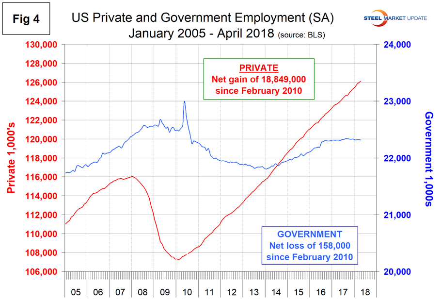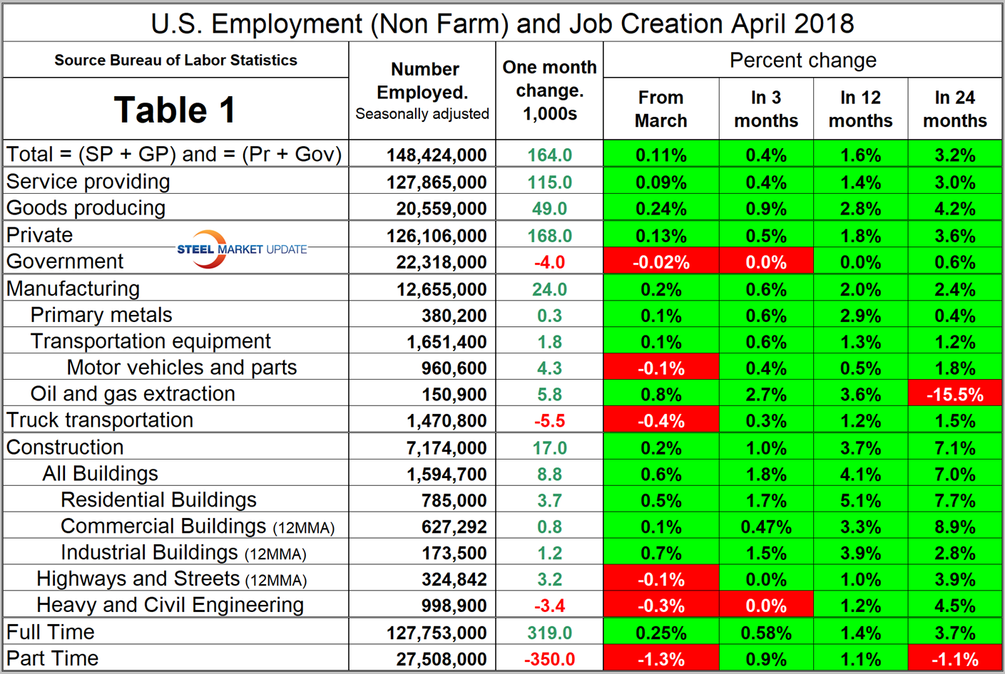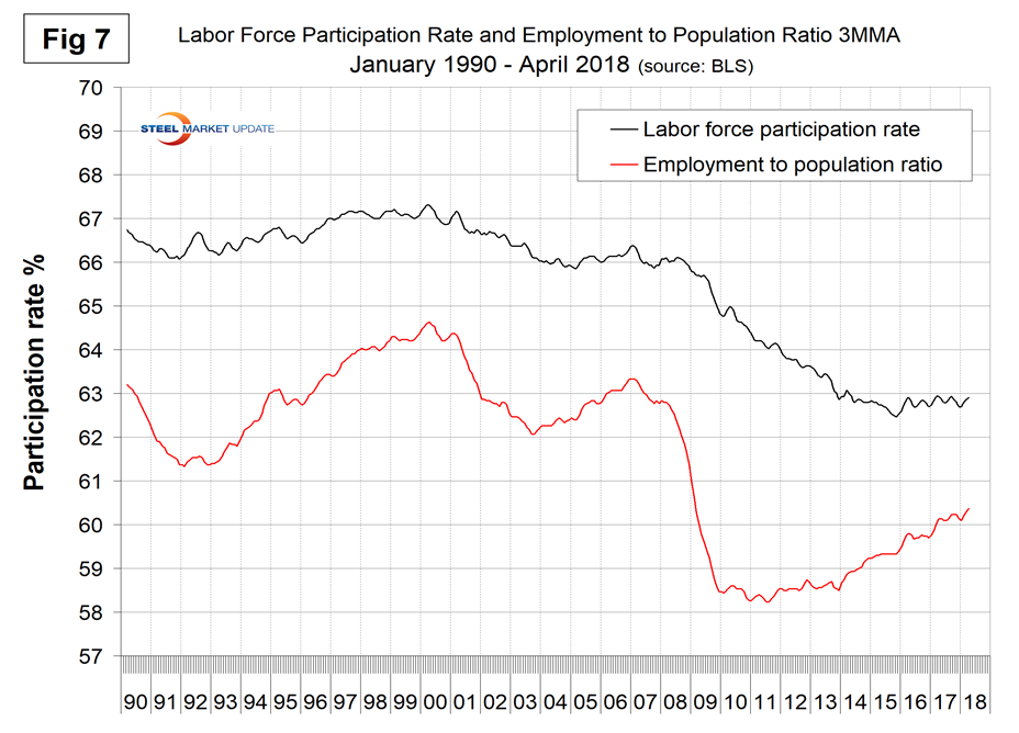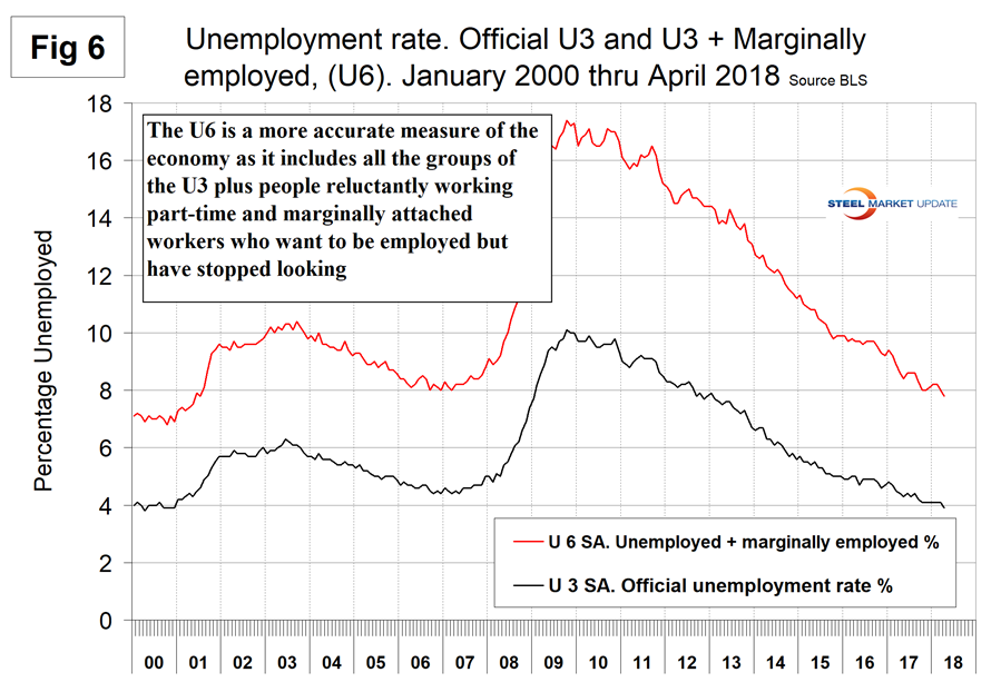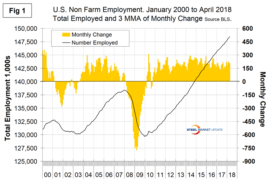 SMU Comment: There were no negatives in the April jobs report. As 2018 unfolds, the employment situation is very good, job openings are near an all-time high, and new claims for unemployment are at a 44-year low. Manufacturing employment is 2.0 percent higher than this time last year and construction is up by 3.7 percent. The employment situation has been described as “full” by some analysts and unit labor costs were up in Q4 2017 and Q1 2018. Employment growth in manufacturing and construction is predictive of steel sales activity.