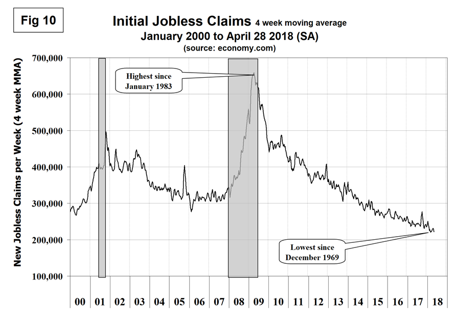 Initial claims for unemployment insurance, reported weekly by the Department of Labor, flattened in 2017 except for the hurricane-driven spike. New claims in April were at the lowest level since 1969. In the week ending April 28, initial claims were 211,000 with a four-week moving average of 221,500 claims. This is a continuation of the longest streak since 1973 of initial claims below 300,000 (Figure 10).