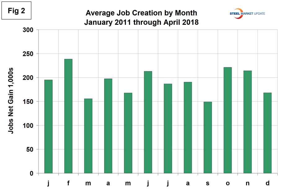 To examine if any seasonality is left in the data after adjustment, we have developed Figure 2. In the eight years since and including 2011, March has been the second lowest job creation month of the year, which we attribute to poor seasonal adjustment. On average in those years, April has increased by 27 percent. This year, April rose by 21 percent, therefore fairly typical. In the April report, job creation in March was revised up by 32,000 and February down by 2,000 jobs.