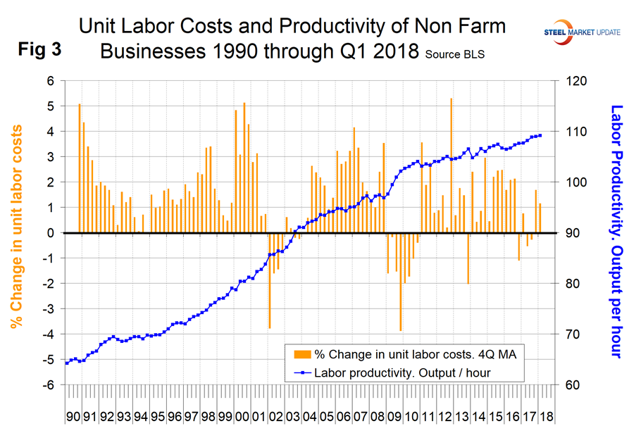 Unit labor costs and productivity changes are reported quarterly by the BLS and Q1 2018 data was reported in early May. The average increase in unit labor costs in the four quarters through Q1 2018 was 1.15 percent per quarter. The total change in output per hour of all nonfarm businesses was 1.3 percent in the four quarters through Q1 2018.