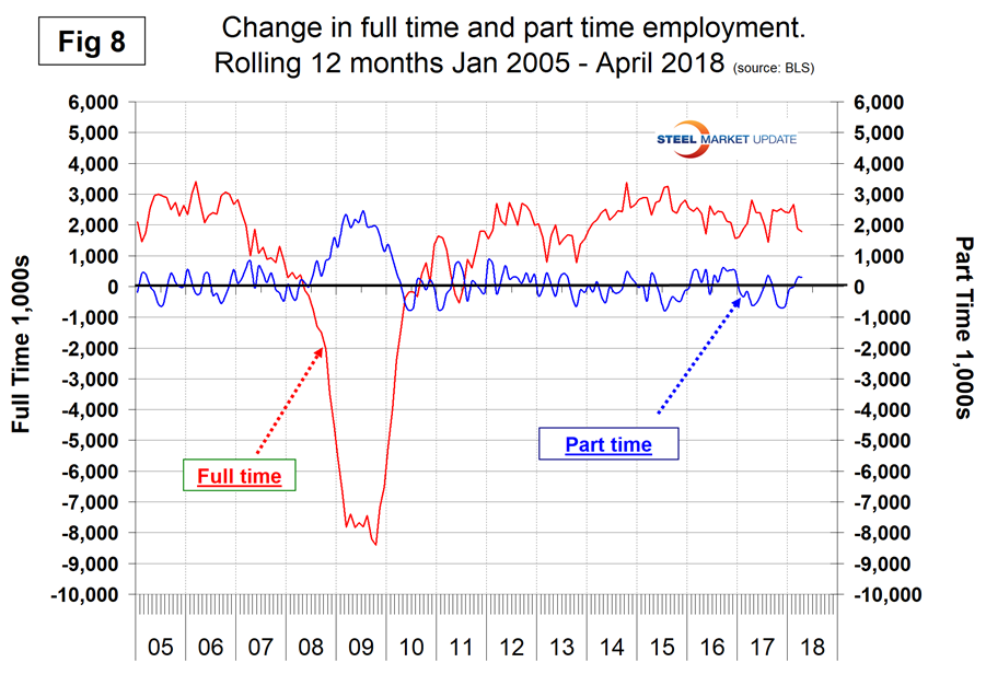 In the 40 months since and including January 2015, there has been an increase of 7,819,000 full-time and only 2,000 part-time jobs. Figure 8 shows the rolling 12-month change in both part-time and full-time employment. This data comes from the Household survey and part-time is defined as less than 35 hours per week. Because the full-time/part-time data comes from the Household survey and the headline job creation number comes from the Establishment survey, the two cannot be compared in any given month. To overcome the volatility in the part-time numbers, we must look at longer time periods than a month or even a quarter, which is why we look at a rolling 12 months for the full-time and part-time employment picture shown in Figure 8.