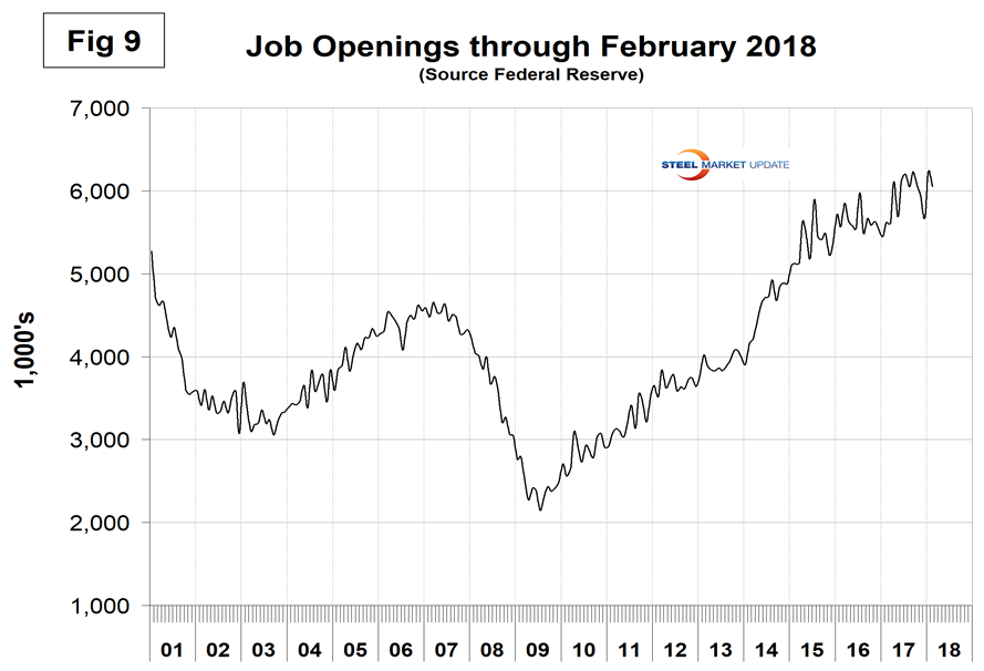 The job openings report known as JOLTS is reported on about the 10th of the month by the Federal Reserve and is over a month in arrears. Figure 9 shows the history of unfilled job openings through February when openings stood at 6,052,000, down from the January count of 6,312,000 which was an all-time high. There has been an improving trend since mid-2009.