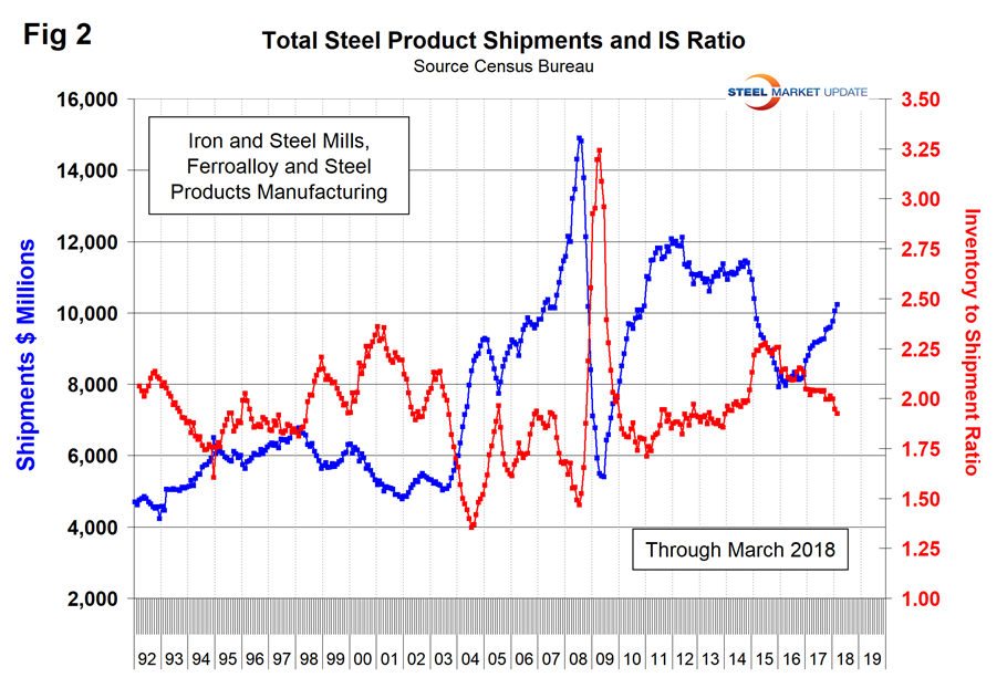 Steel shipments and inventories are increasing as the inventory-to-shipment ratio is decreasing, which is a very healthy trend for the supply chain. To efficiently manage inventory, companies generally want to keep the ratio low. A rise in the inventory-to-shipment ratio indicates that shipments are falling, or the operation is keeping too much inventory on hand, or both.