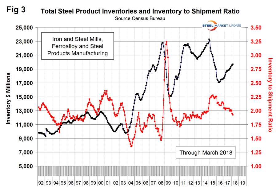 Figure 3 shows total inventory in millions of dollars and repeats the inventory-to-shipment ratio shown in Figure 2. Since July 2016, total inventories through March 2018 grew by 14.4 percent, but the inventory-to-shipment ratio declined from 2.09 to 1.92 in that time frame. The ratio is down from 2.26 in January 2016.