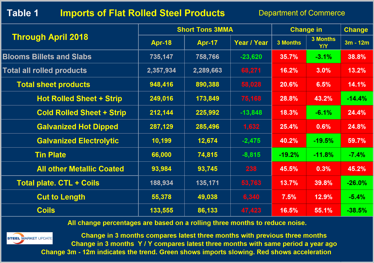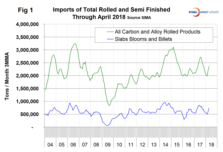 Total rolled steel product imports in April were the highest since last June and semi-finished imports were the highest since October 2014 as offshore mills hurried to ship steel ahead of the tariffs that were expected to take effect May 1.