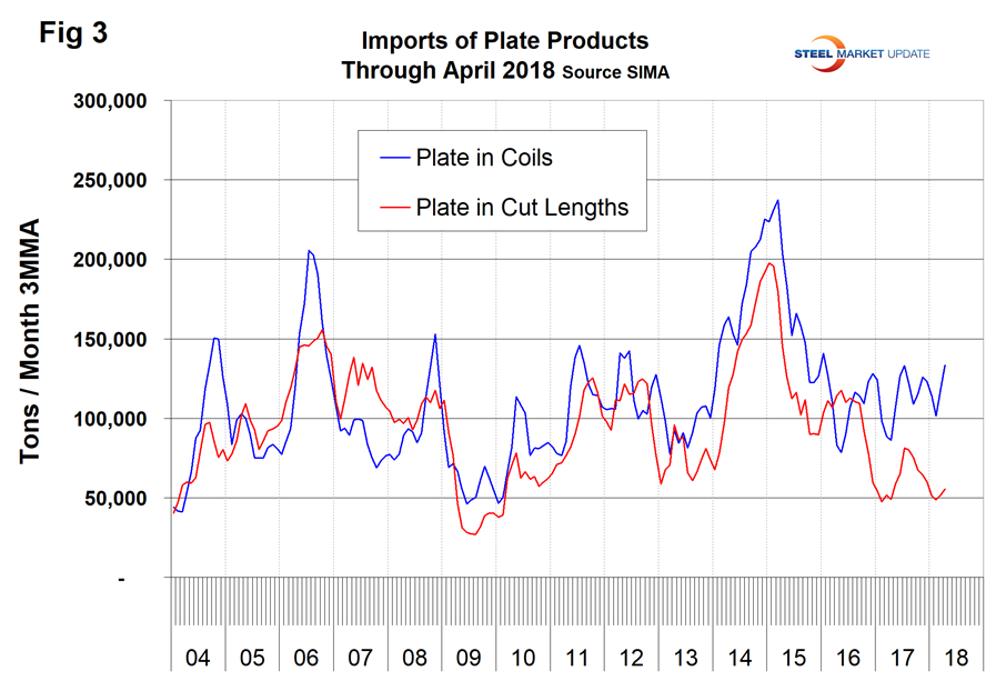 Figure 1 shows the tonnage of total rolled steel and semi-finished imports through April on a 3MMA basis. The 3MMA of total rolled product import volume in July 2017 was 2,722,567 tons, the highest since May 2015. Imports declined every month on this basis through February 2018 when they reached 1,977,871 tons. This was the first time to dip below two million tons since May 2016. The 3MMA of rolled product imports increased in March and April to 2,175,838 and 2,357,934 tons, respectively. Semi-finished imports increased in March and April from February’s very low volume to the highest level since December 2014. On a 3MMA basis, the import volume of semis was the highest since August last year. The current three-month analysis includes the very low February number; therefore, we can expect this measure to surge in May.