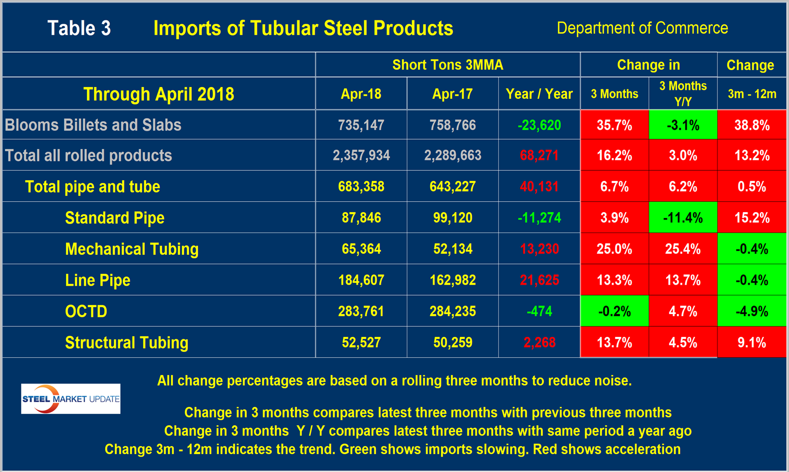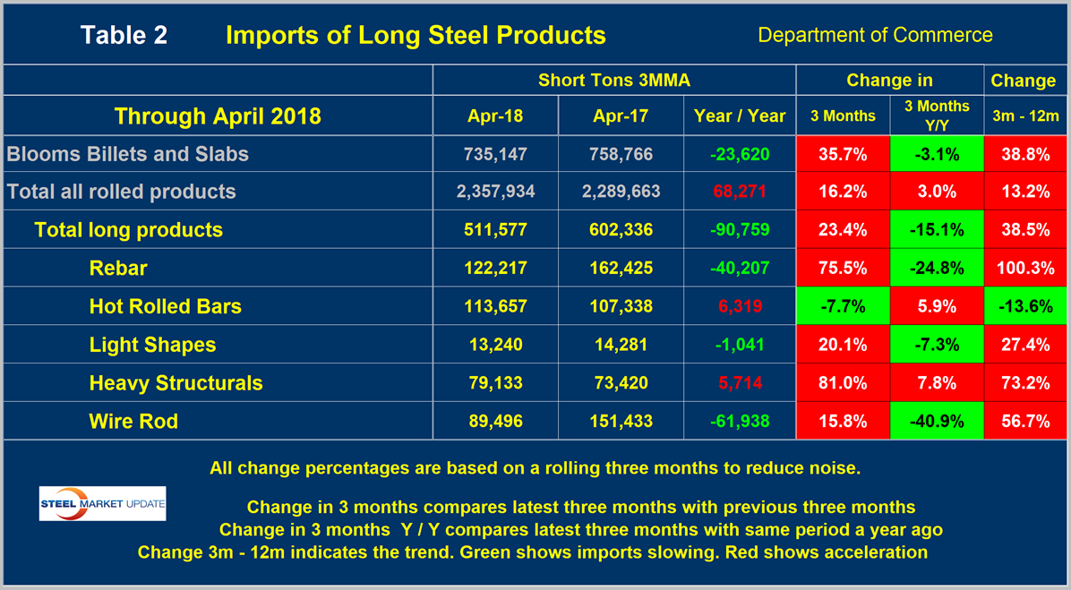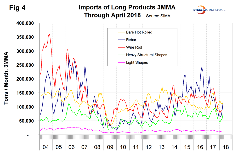 Table 2 shows the same analysis for long products where 3M/3M imports were up by 23.4 percent led by rebar up by 75.5 percent and heavy structurals up by 81.0 percent. Figure 4 shows the history of long product imports.