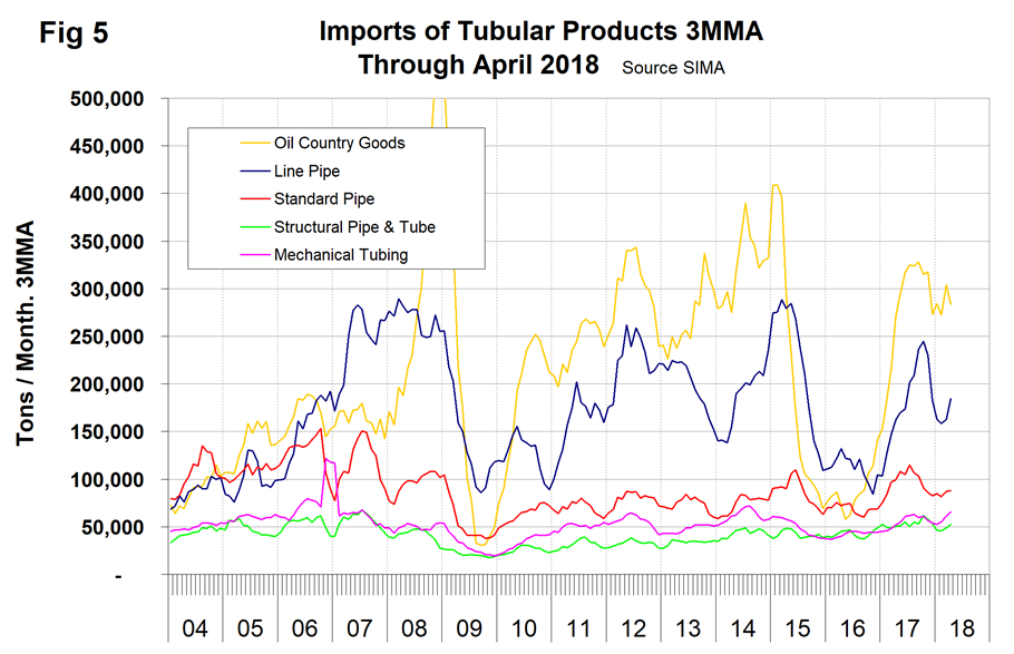 Table 3 shows that for tubular products the 3M/3M volume was up by 6.7 percent and the year-over-year volume was up by 6.2 percent. OCTG had a slight decrease 3M/3M, but mechanical tubing was up by 25.0 percent. Figure 5 shows the history of tubular imports since 2004.