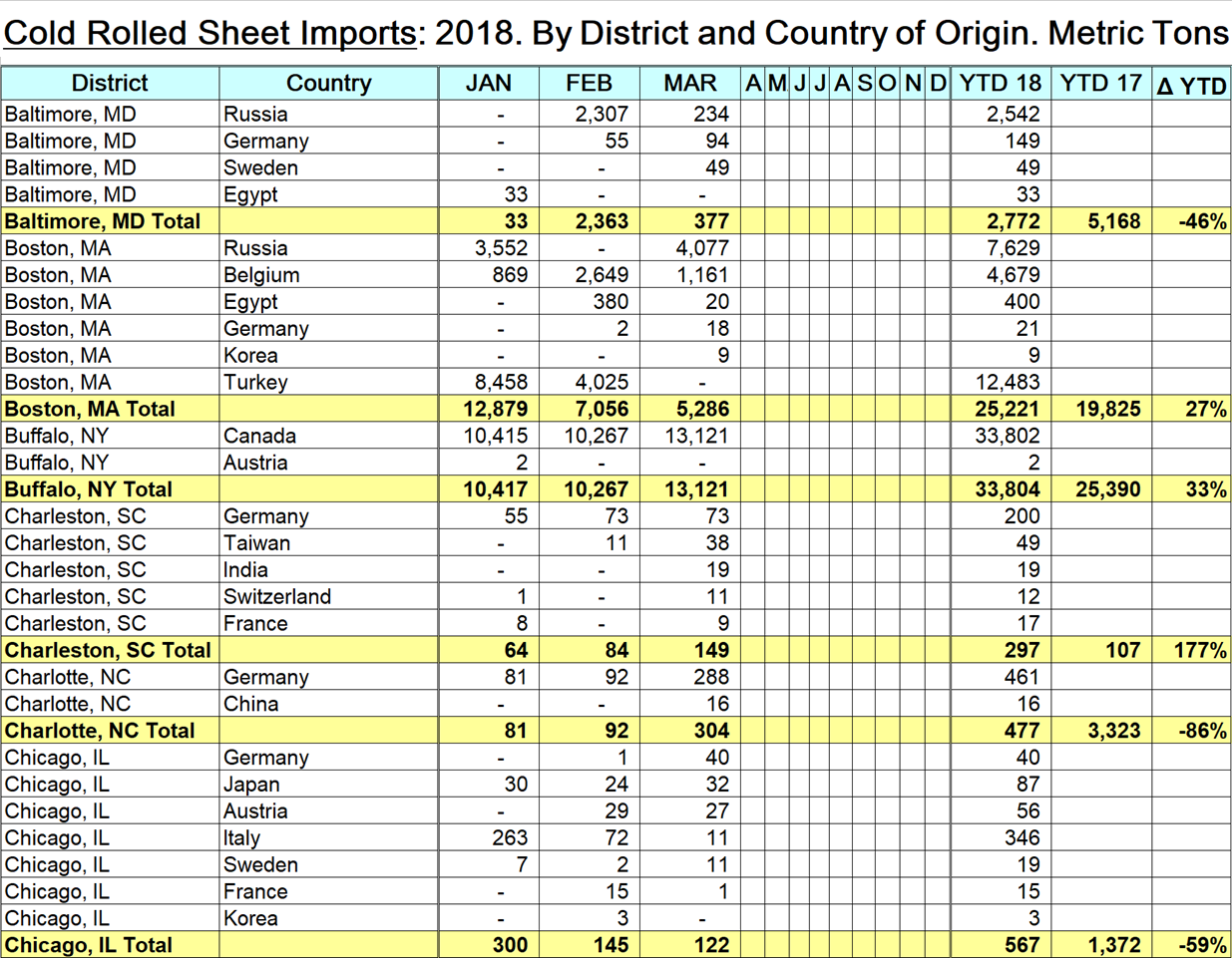 The data in these detailed reports is compiled from tariff and trade data published by the U.S. Department of Commerce and the U.S. International Trade Commission. Our other import reports are sourced from U.S. Department of Commerce, Enforcement and Compliance, aka the Steel Import Monitoring System. In the development of these reports by district and source country, we have discovered that the SIMA data for HRC and CRC contains some high-alloy steel such as stainless and tool steel, which have been misclassified at the ports. These alloy steels are not included in our detailed reports, which results in a small discrepancy between the two data sets.