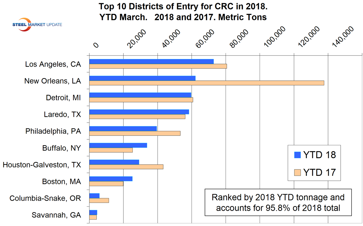 The table included here is a small part of the detailed analysis of the cold rolled tonnage. The bar graph shows the tonnage of CR that entered the top 10 districts in YTD March for 2017 and 2018 ranked by 2018 tonnage. Los Angeles had the most tonnage through March, and the top 10 districts accounted for 95.8 percent of the total national tonnage.