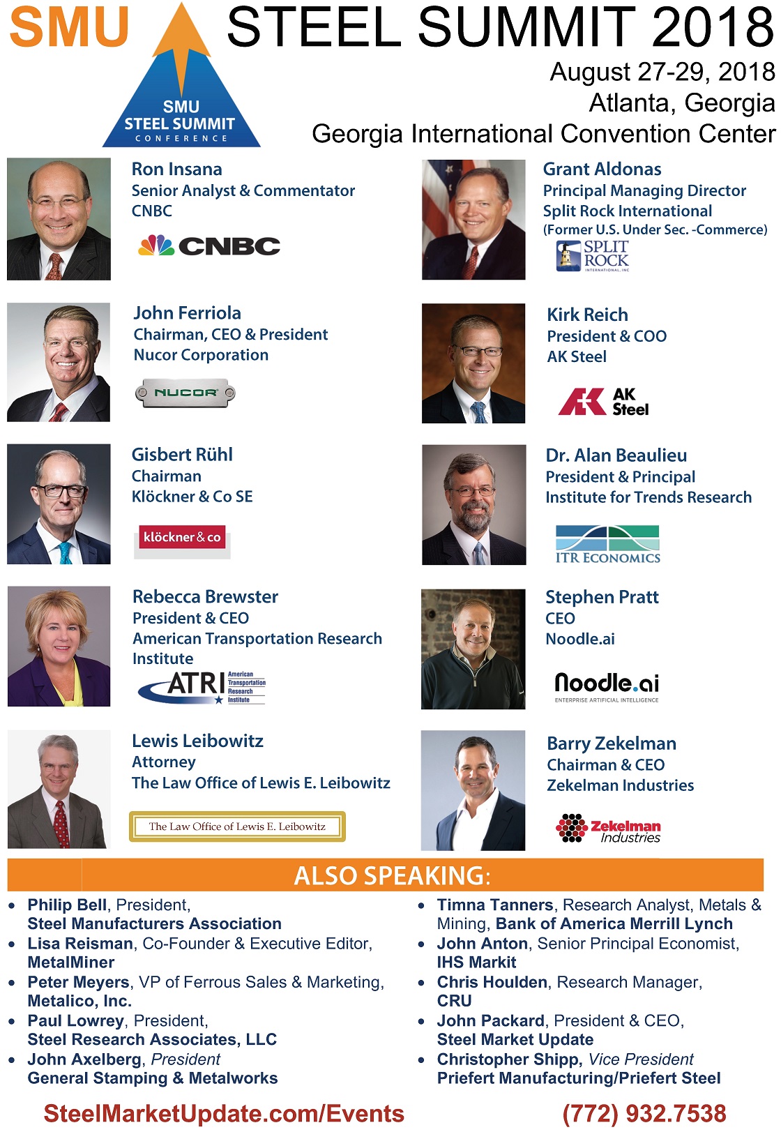 For Steel Market Update’s upcoming steel summit Aug. 27-29 in Atlanta, we have recruited an exceptional group of speakers who are prepared to talk on a wide variety of topics of importance to those in the flat rolled and plate steel markets as manufacturers, distributors, steel mills, toll processors or suppliers to those industries.