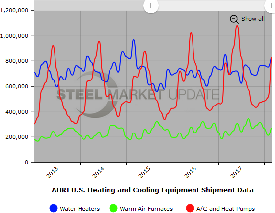 Below is a graph showing the history of water heater, warm air furnace, and air conditioner shipments. You will need to view the graph on our website to use it’s interactive features; you can do so by clicking here. If you need assistance with either logging in or navigating the website, please contact our office at 800-432-3475 or info@SteelMarketUpdate.com.