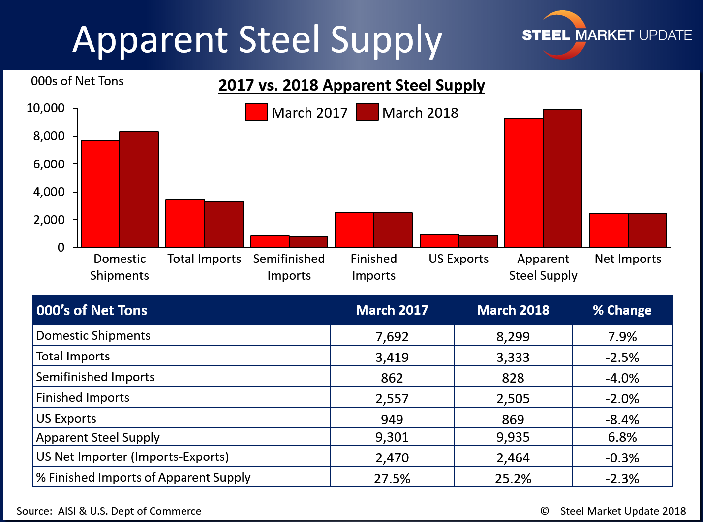 March apparent steel supply rose 13.2 percent over February to 9,935,479 net tons, according to the latest data from the U.S. Department of Commerce and the American Iron and Steel Institute. Apparent steel supply is calculated by adding domestic steel shipments and finished U.S. steel imports, then subtracting total U.S. steel exports.