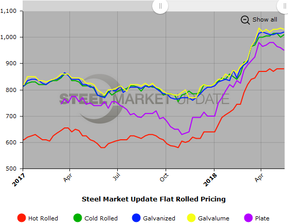 SMU Note: Below is a graphic showing our hot rolled, cold rolled, galvanized, Galvalume, and plate price history. This data is available here on our website with our interactive pricing tool. Note that plate prices are not yet available on our website, but we are in the process of adding that dataset. If you need help navigating the website or need to know your login information, contact us at info@SteelMarketUpdate.com or 800-432-3475.