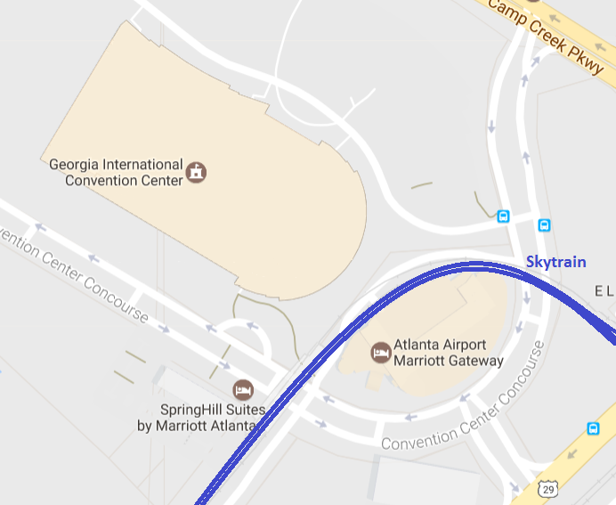 The three Gateway hotels are all located next to the GICC and are easily accessible from the complimentary Atlanta Airport SkyTrain. They are all a two-minute walk from the Georgia International Convention Center. The Atlanta Airport Marriott hotel will offer a shuttle bus to and from the GICC, running Monday from noon-6 p.m., Tuesday 6:45 a.m.-9:45 a.m. and 3:00 p.m.-6:00 p.m., and Wednesday 6:45.a.m.-9:45 a.m. and 1:00 p.m.-4:00 p.m. The SkyTrain does not go to the Atlanta Airport Marriott hotel, and a short cab ride or car rental will be needed to reach the hotel.