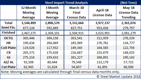 Foreign steel imports for May are trending toward a 2.3 million net ton month, based on the data released by the U.S. Department of Commerce earlier this week. April imports were just shy 4.0 million net tons.