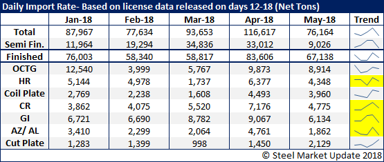 In the graphic below, we are tracking the license rate for the first two weeks of a month and then comparing May’s licenses with the average. As you can see,, virtually every individual item is down with the exception of plate products and oil country tubular goods (OCTG).