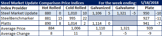 Cold rolled prices were seen as being higher by all three indexes with Platts being the highest at $1,014 per ton, followed by SMU at $1,010 per ton and SteelBenchmarker at $995 per ton.