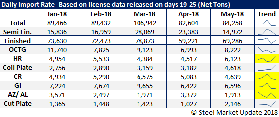 Below is a table we use along with a graphic depicting how imports have been trending during the first 19-25 days of a month. What is shown is the daily import license rate, and the May rate is compared against that of April, March, February and January 2018. We are seeing a rising trend in hot rolled, coiled plate and cut plate. All of the other flat rolled items (shaded yellow items) are trending lower.