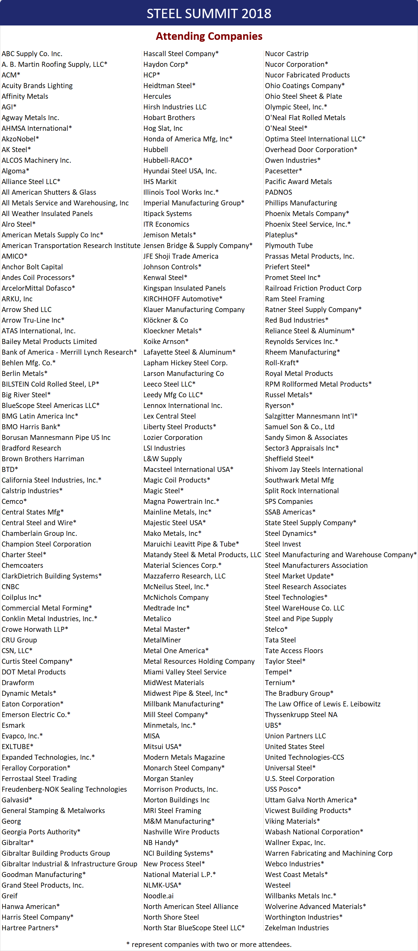 Last year, it took Steel Market Update until Aug. 1 to reach the number of registrations already booked for the 2018 SMU Steel Summit Conference. On Tuesday alone we received registrations from: Duferco, L&W Supply, A.B. Martin Roofing Supply, Ryerson, Lapham-Hickey Steel and Roll-Kraft. We are just a few people shy of 550 and on our way toward 600. Last year our total registrations was 667 executives (17 of which received refunds due to the Houston hurricane). We are confident we will reach our goal of 800 attendees and close to 300 companies for this year’s SMU Steel Summit Conference.