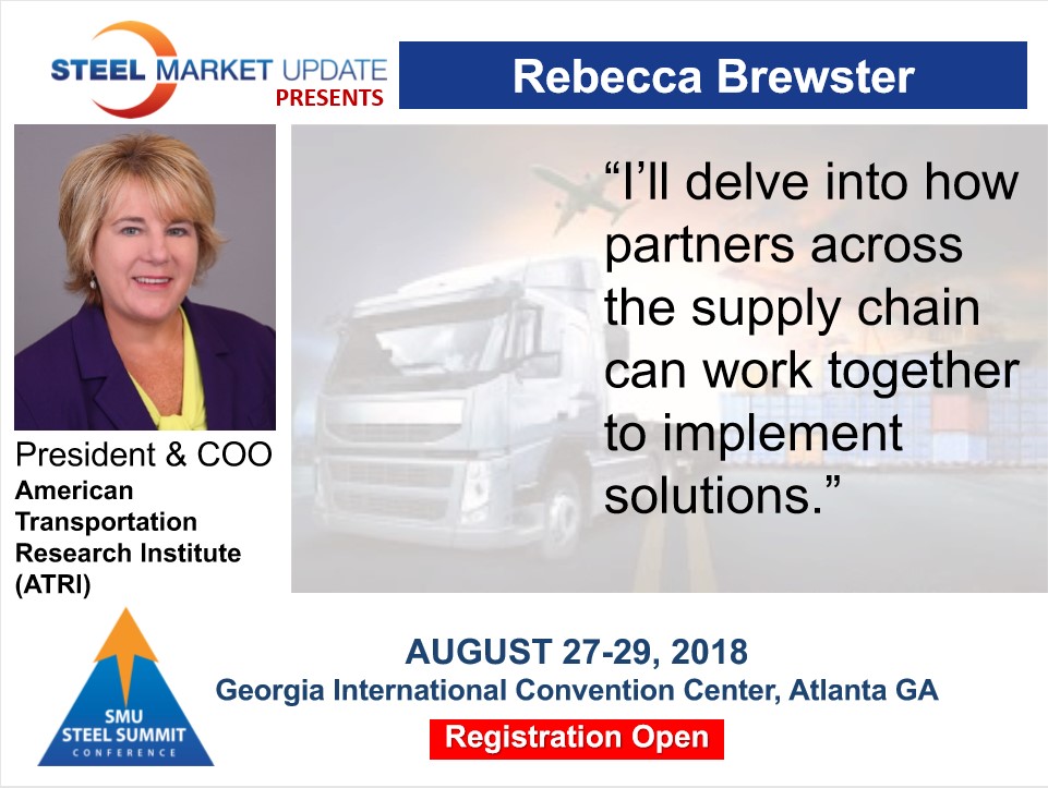 Brewster is the president and chief operating officer of the American Transportation Research Institute in Arlington, Va. ATRI researches trucking-related issues including the cost of congestion caused by the nation’s aging infrastructure, driver retention and the effects of the driver shortage, operational costs, safety, technology and the environment, among others. Brewster will be a featured speaker on Tuesday, Aug. 28, during Steel Market Update’s upcoming steel summit in Atlanta.