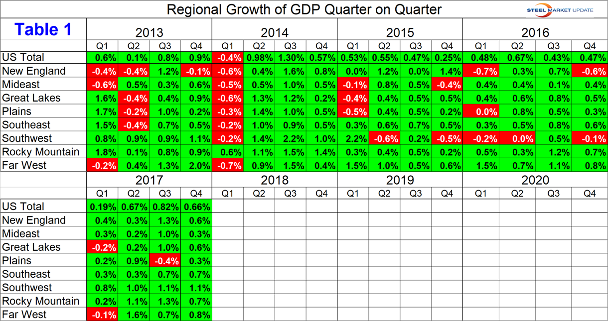 The BEA introduced a new data set for GDP by state and region in 2014 and backdated it to Q1 2005. This week, the data was updated through Q4 2017. Even though this might be considered historically “old,” we think it’s worth reporting because it’s the foundation for where we are now. The data is published quarterly and is reported in chained 2009 dollars seasonally adjusted. Steel Market Update analyzes the data and reports to subscribers quarterly by region. Data and graphs for an individual state are available on request.