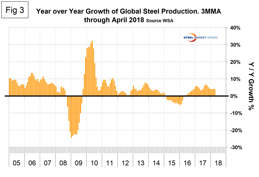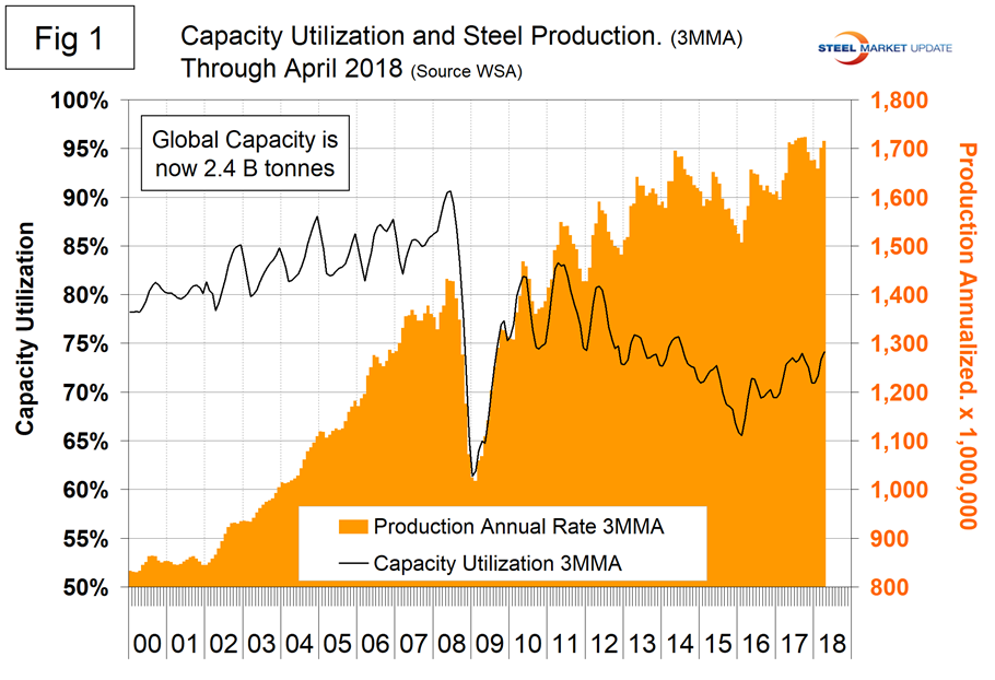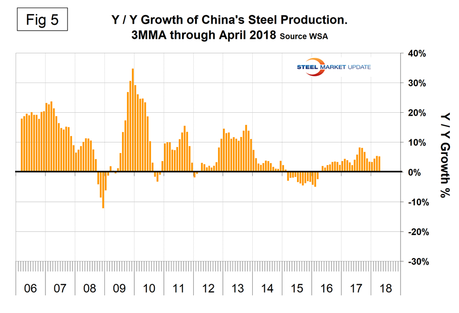 Figure 4 shows China’s production since 2005 and Figure 5 shows the year-over-year growth. In the three months through January 2018, China’s growth rate was lower than the rest of the world. That changed in February through April this year when China’s growth exceeded the rest of the world by 0.5, 1.3 and 1.2 percent, respectively. China now has an all-time high share of global production at 51.7 percent. As we have said before in these SMU updates, cutting capacity is not the same thing as cutting production when capacity utilization is as low as it is today.