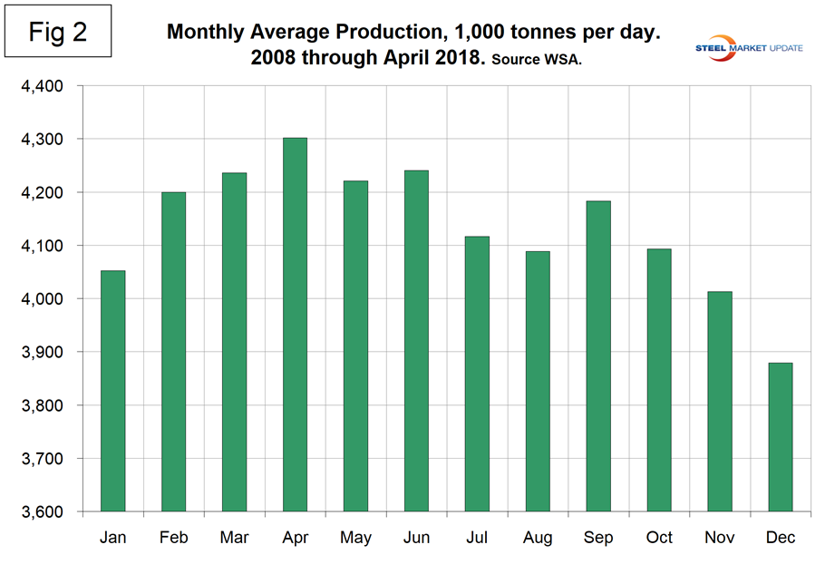 In 2017, total global steel production hit 1.645 billion metric tons, up by 5.0 percent from 2016. Production in the month of April 2018 totaled 148,322,000 metric tons, down from 148,422,000 in the month of March. Capacity utilization in April was 75.0 percent. The three-month moving averages (3MMA) that we prefer to use were 142,963,000 metric tons and 74.1 percent, respectively. Figure 1 shows monthly production and capacity utilization since January 2000. The summer slowdown that occurred in each of the seven years 2010 through 2016 was delayed until November last year. On a tons-per-day basis, production in April was 4.944 million metric tons with a 3MMA of 4.817 million metric tons. This was an all-time high on both counts. In December 2016, the OECD’s steel committee estimated that global capacity would increase by almost 58 million metric tons per year between 2016 and 2018 bringing the total to 2.43 billion tons. That forecast is coming to pass as capacity is now 2.4 billion tons.