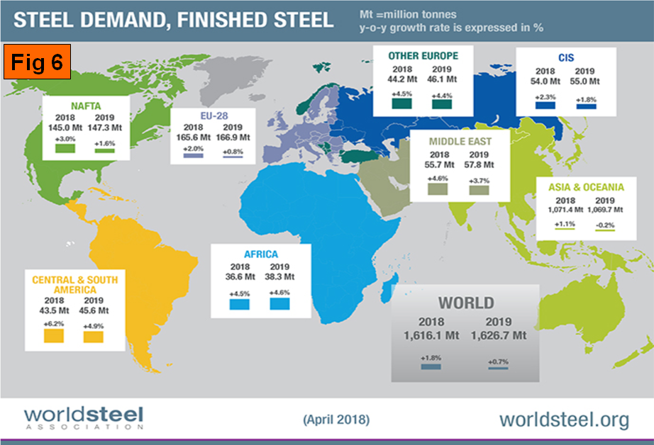 The April WSA Short Range Outlook (SRO) for apparent steel consumption in 2018 and 2019 is shown by region in Figure 6. The WSA forecasts global steel demand will reach 1,616.1 million tons in 2018, an increase of 1.8 percent over 2017. In 2019, it is forecast that global steel demand will grow by 0.7 percent to reach 1,626.7 million tons. Commenting on the outlook, WSA Economics Committee Chairman T.V. Narendran said, “In the next couple of years the global economic situation is expected to remain favorable with high confidence and strengthening recovery of investment levels in advanced economies. Benefitting from this, steel demand in both developed and developing economies is expected to show sustained growth momentum with risks relatively limited. However, possible adverse impact from rising trade tensions and the probable U.S. and EU interest rate movements could erode this current momentum. The outlook for steel demand in the U.S. remains robust on the back of the strong economic fundamentals – strong consumption and investment due to high confidence, rising income and low interest rates. The manufacturing sector is being supported by a low dollar and increasing investment, while rising housing prices and steady non-residential sector growth point to a healthy construction sector. Though the recent tax reform is further expected to boost steel demand through its positive impact on investment, there is some concern over a possible overheating of the economy. The announced infrastructure plan is unlikely to affect steel demand in the short term.”