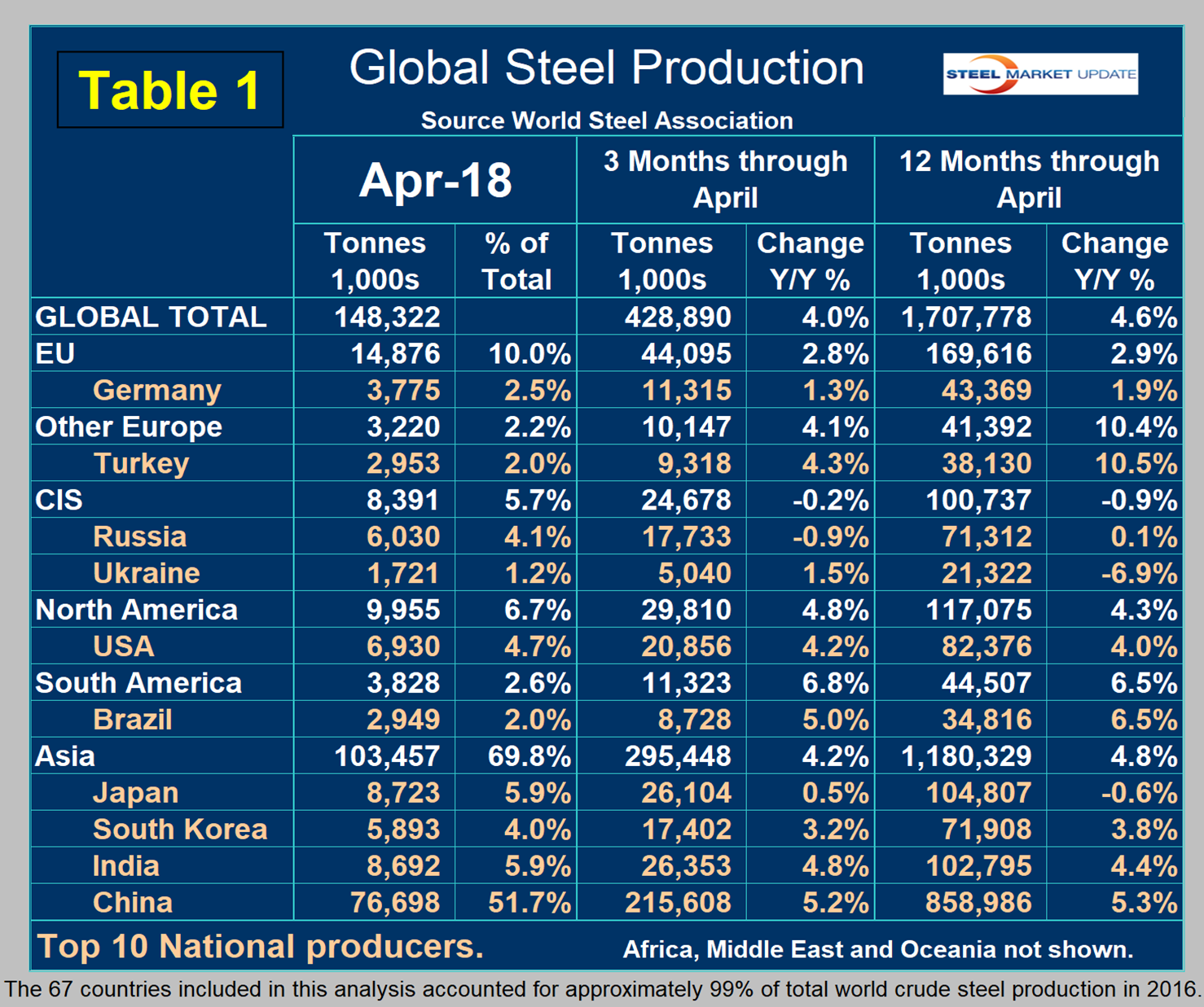 SMU Comment: If present trends continue, Chinese pressure on the global steel market will worsen. In three months through April, China’s production grew by 5.2 percent, almost twice as fast as the rest of the world. It looks as though all the talk about cutting capacity is just a smoke screen. Reality seems to be that old plants are being closed as existing ones increase production and new plants come on stream. WSA increased its forecast for steel consumption in 2018 from 1,548.5 million metric tons in its April 2017 forecast to 1,616.1 million metric tons in its April 2018 forecast. In its April forecast, the IMF raised its projection for global economic growth in 2018 and 2019, which will have a positive effect on global steel consumption, particularly in the developing world.