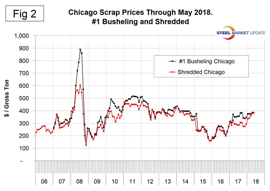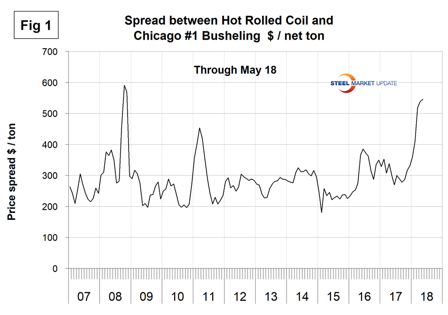 To put this raw materials commentary into perspective, Figure 1 shows the spread between Chicago #1 busheling and hot rolled coil ex works Indiana through May 18, both in dollars per net ton. The spread at $546.25 is now higher than at any time since the bubble of Q3 2008 and has increased every month since September 2017 when it stood at $278.48.