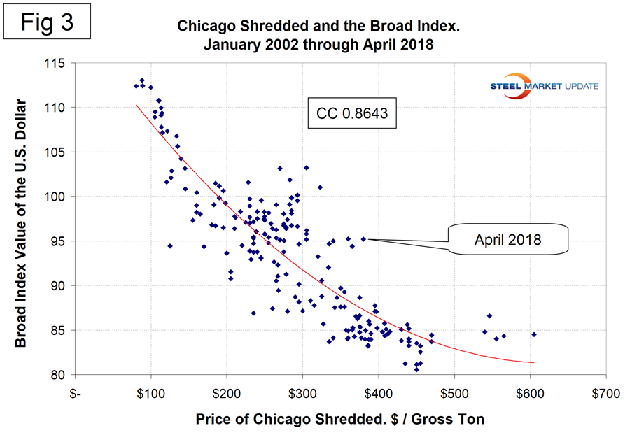 Figure 3 is a scatter gram of the price of Chicago shredded and the Broad Index value of the U.S. dollar as reported by the Federal Reserve. The latest data for the Broad Index is from April. This is a causal relationship with a correlation of over 86 percent.