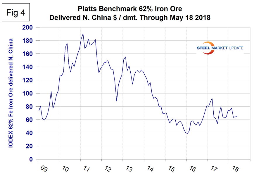 Figure 4 shows the Platts IODEX of 62% Fe delivered North China since January 2009. The Index recovered to $92.30 on March 17, 2017, but declined to $64.50 by May 18, 2018.