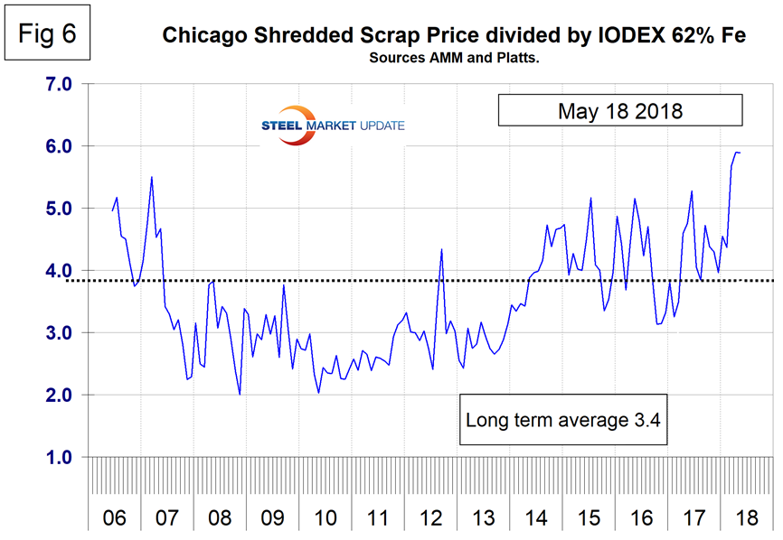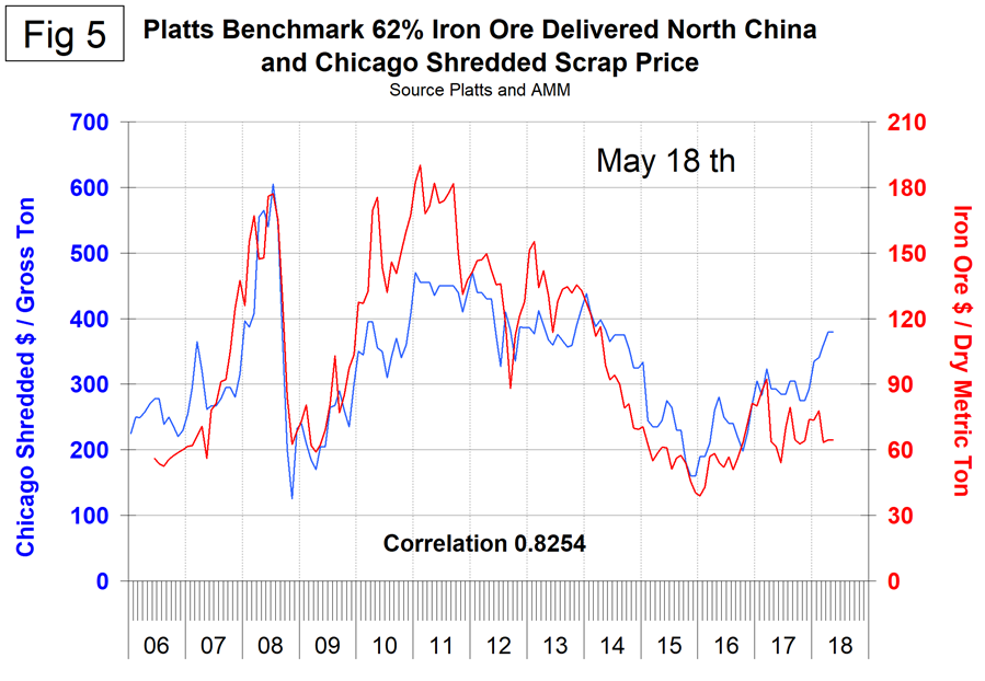 There is a long-term relationship between the prices of iron ore and scrap. Figure 5 shows the IODEX and the price of Chicago shredded through May 18.