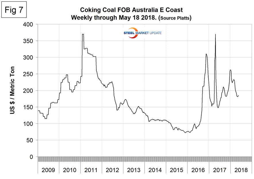 Coking coal prices have been very erratic in the last 18 months. From mid-October 2017 to the end of December 2017, premium hard low volatile coking coal prices rose from $181.50 per metric ton to $262.25 FOB Australia’s East Coast (Figure 7). Since then, the price has declined to $184.75 on May 18.