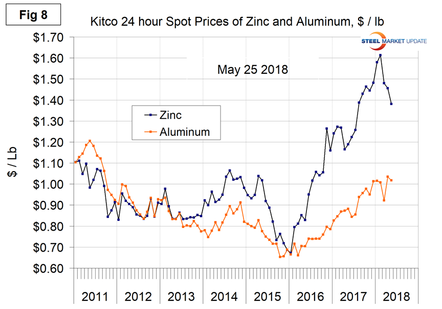 Kitco publishes a daily spot price of zinc, which we have transcribed to Figure 8. Just as a point of reference, we have included aluminum in the same graph. The price of zinc on May 25 was $1.3813 per pound, down from a high of $1.6134 on Feb. 21.