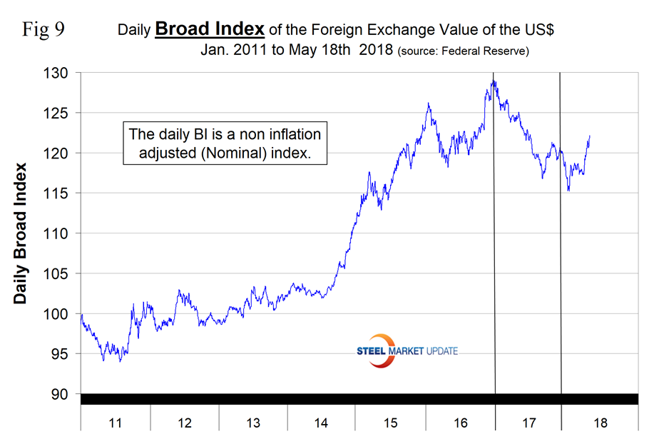 SMU Comment: There is an inverse relationship between commodity prices and the value of the U.S. dollar on the global currency markets. There has been a sharp reversal in the value of the dollar, which has strengthened by 6.04 percent since Feb. 1 (Figure 10). A rising dollar puts downward pressure on the price of those global commodities that are priced in dollars, as is clearly shown by the relationship between scrap and the dollar index described above.