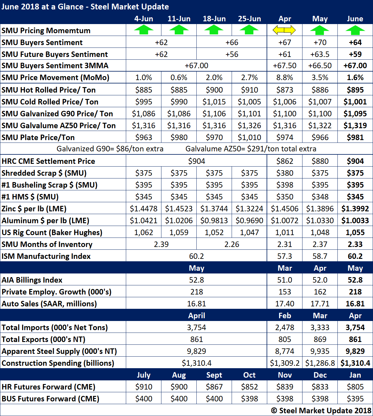 In the table below, Steel Market Update provides a snapshot of flat rolled steel pricing, commodities that affected steel prices, and economic data of importance to the flat rolled steel industry in June.