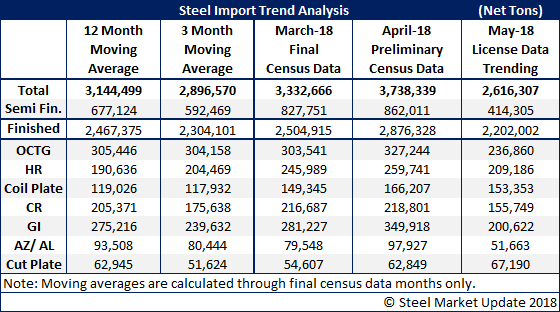 Based on the latest license data from the U.S. Department of Commerce reported earlier this week, we are expecting the trend for May steel imports to total approximatley 2.6 million net tons. That’s just over one million tons less than what was imported in April. We continue to see strength in coil and sheet plate imports. Finished imports are trending toward 2.2 million net tons, approximately 675,000 net tons less than April.