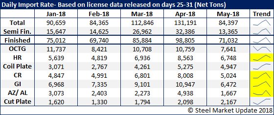 The table below shows the daily import rate based on license data collected between the 25th and 31st days of each month. Plate imports remain strong in May, but all other products listed are down considerably compared to April.