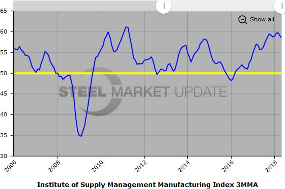 Below is a graph showing the history of the ISM Manufacturing Index as a three-month moving average. You will need to view the graph on our website to use its interactive features; you can do so by clicking here. If you need assistance logging in to or navigating the website, please contact Brett at 706-216-2140 or Brett@SteelMarketUpdate.com.