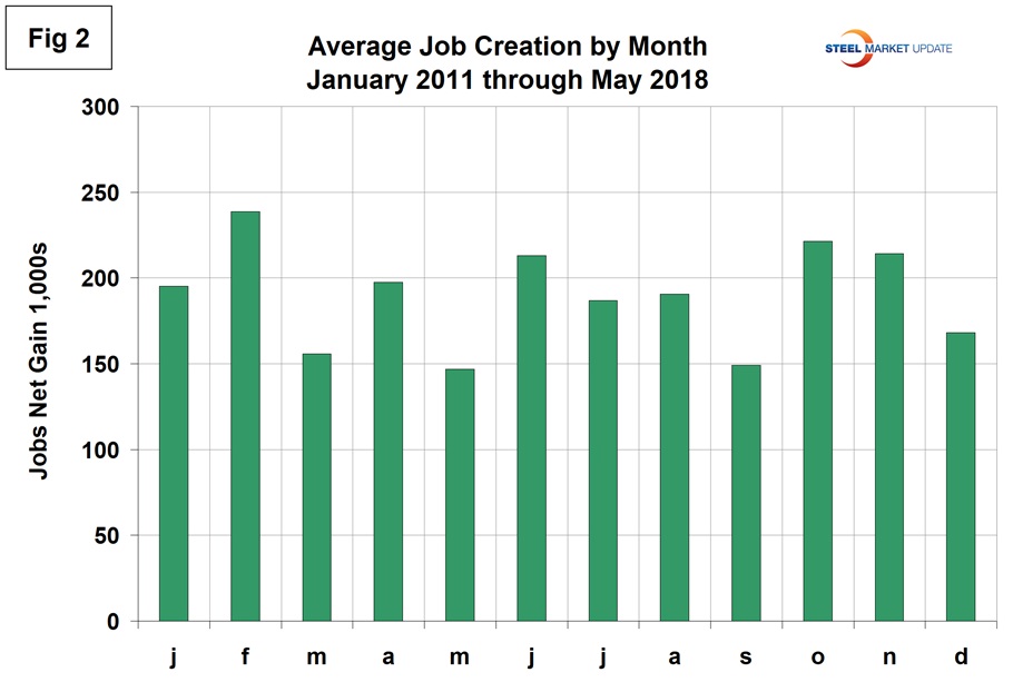 Rising employment and wages are the basis of GDP growth because personal consumption accounts for almost 70 percent of GDP. Steel consumption is related to GDP; therefore, we need to be aware of changes to the employment picture. Net job creation in May, as reported by the BLS on Friday, was up by 64,000 from April’s downwardly revised count. In this context, net means the difference between gains and losses, which are both much larger numbers than we are used to considering. Over a seven-year period, gains averaged 7,211,000 per quarter as losses averaged 6,597,000 on the same basis.