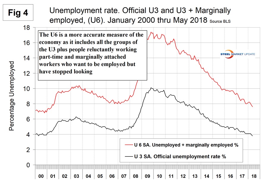 The official unemployment rate, U3, reported in the BLS Household survey (see explanation below) came in at 3.8 percent, down from 3.9 percent in April and the lowest value since our data stream began in January 2000 when the rate was 3.8 percent. This is not a very representative number. The more comprehensive U6 unemployment rate declined from 9.2 percent in January last year to 7.6 percent in this latest report (Figure 4). U6 includes individuals working part time who desire full-time work and those who want to work but are so discouraged they have stopped looking. The differential between these rates was usually less than 4 percent before the recession; in May it was 3.8 percent.