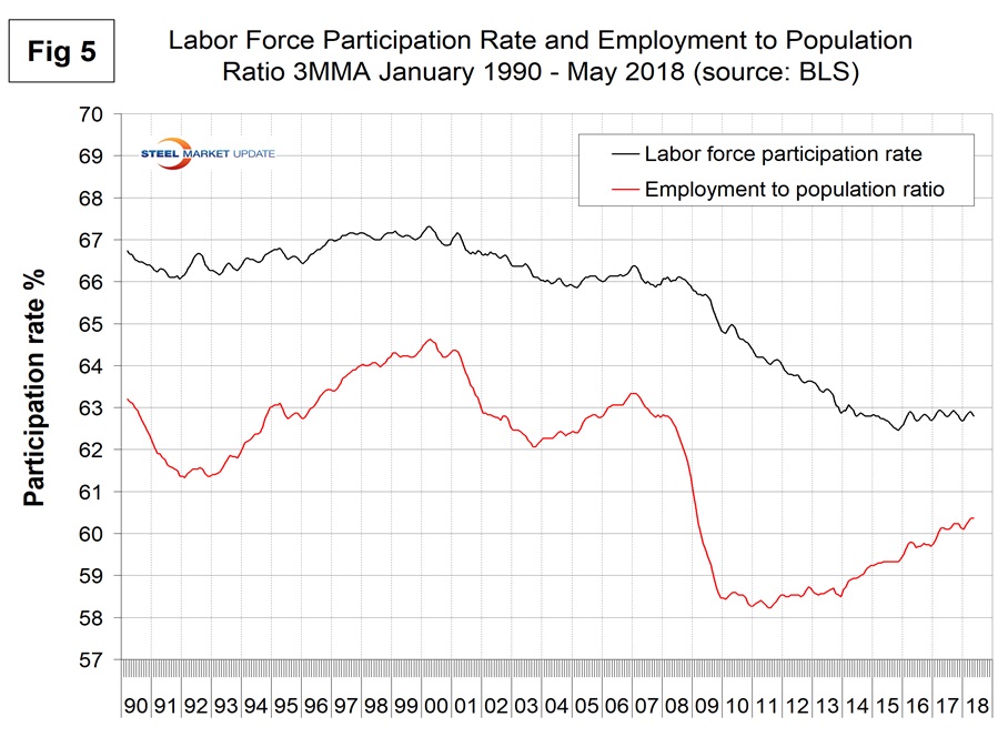 The employment participation rate is calculated by dividing the number of people actively participating in the labor force by the total number of people eligible to participate. This measure was 62.8 percent in May, the same as it was in May two years ago. Another gauge is the number employed as a percentage of the population, which we think is more definitive. In May, the employment-to-population ratio was 60.4 percent, up from 59.7 percent in May 2016. The employment-to-population ratio has made progress for the last four years, but the labor force participation rate has been stalled for two years. Figure 5 shows both measures on one graph.