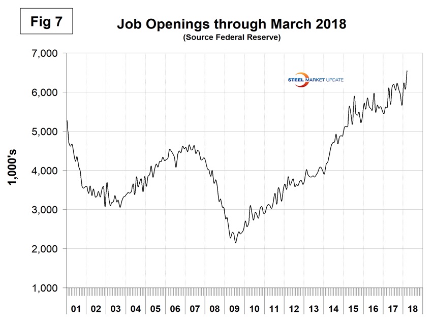 The job openings report known as JOLTS is reported on or about the 10th of the month by the Federal Reserve and is over a month in arrears. Figure 7 shows the history of unfilled job openings through March when openings stood at 6,550, which was the highest in the history of our data. There has been an improving trend since mid-2009.