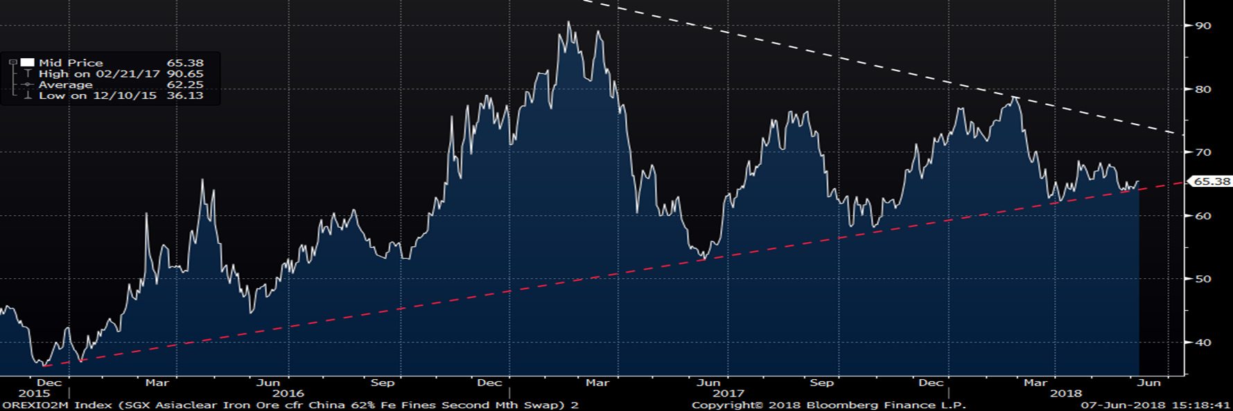 The 2nd month SGX iron ore future closed today at 65.38 still remaining above its long term uptrend line.