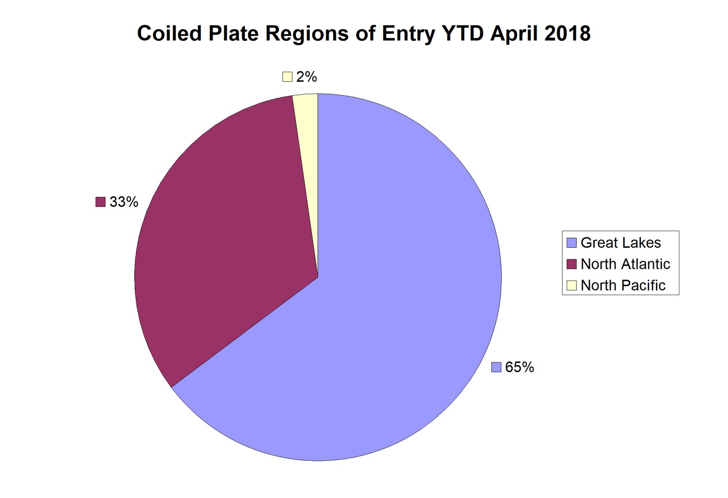 We are still trying to improve the usefulness of this analysis and this month started to look at a broader picture to include seven regions: Pacific North and South, Rio Grande Valley, the Gulf, Atlantic North and South and the Great Lakes. The pie chart here is a regional analysis for coiled plate, which shows some interesting results. Of the total, 65 percent came in through the Great Lakes, 33 percent into the North Atlantic, and 2 percent into the North Pacific, while all other regions were 1 percent or less.